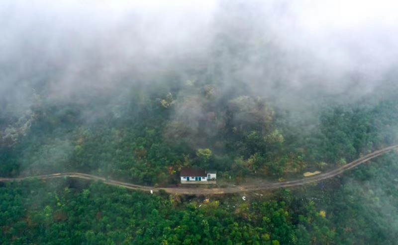 路若盤龍環(huán)戲水,雨灑叢林濕落花。